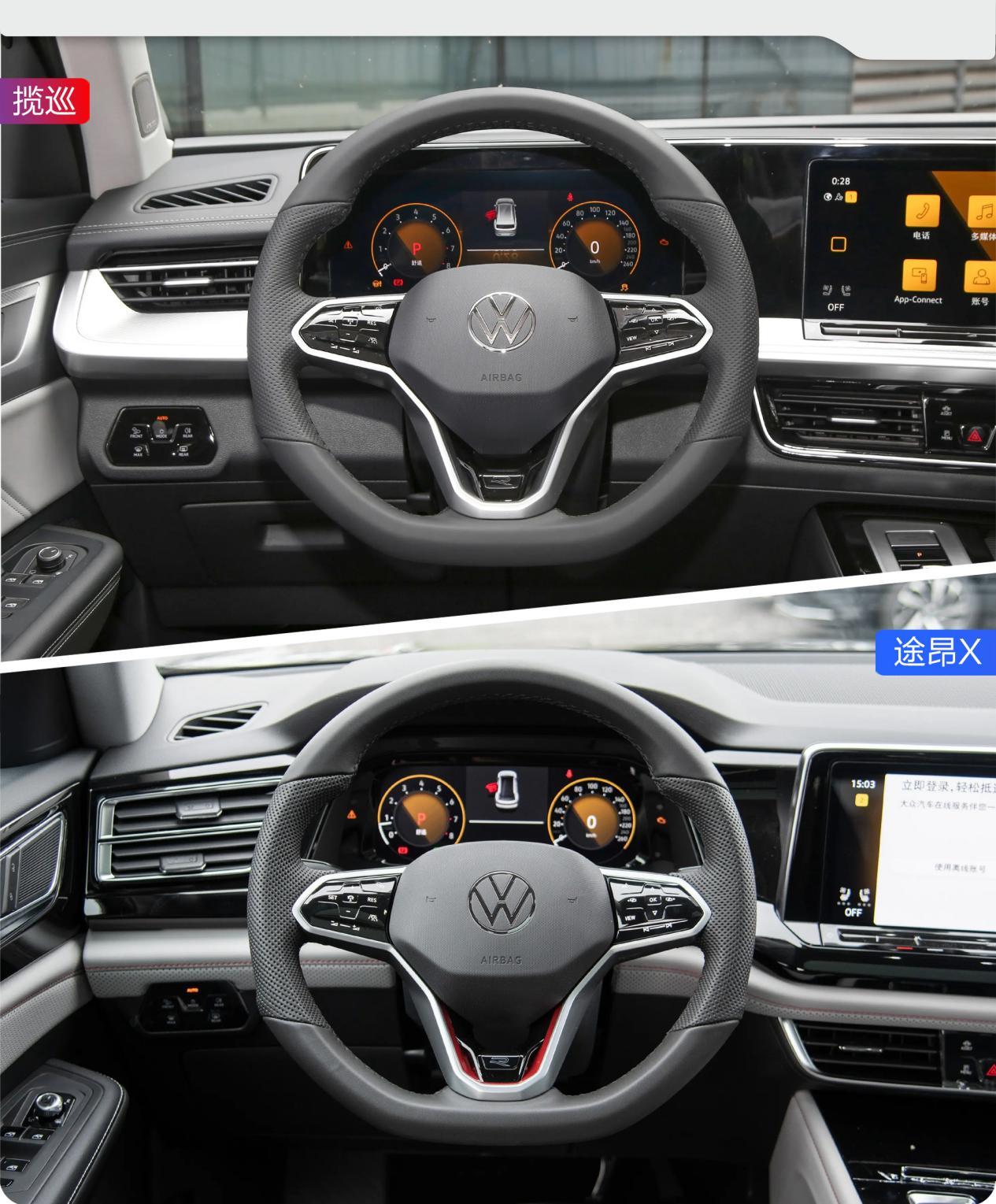 两车都使用了真皮多功能方向盘,上面的多功能按键还都是电容式触摸感应按键,同时还带有震动反馈功能,具有很强的科技感和档次感。此外揽巡还比途昂X多出了换挡拨片,能够带来更多的驾驶乐趣。
