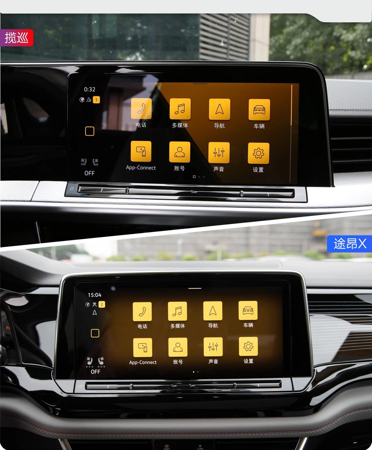 两车都配备了大众品牌最新的IQ.智慧车联-MOS 3.2+系统,功能上都包含CarPlay、CarLife、语音控制、远程控制和丰富的车联网功能,满足消费者在用车、娱乐方面的需求不成问题。其中揽巡的10.25英寸液晶仪表和12英寸中控屏采用了连屏设计,突出科技感的同时还极具视觉震撼效果。