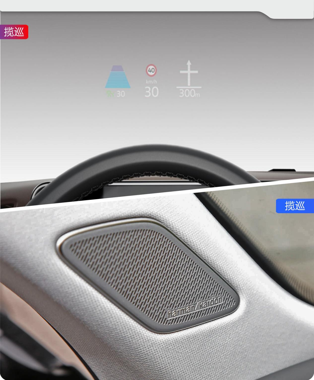 除了上面提到的,揽巡还比途昂X多出了抬头显示、手机无线充电和包含14个扬声器的哈曼卡顿音响(途昂X为8扬声器),其中揽巡搭载的W-HUD抬头显示系统能够显示数字车速、交通标识、报警信息、导航、ACC等信息,驾驶者不必低头就可随时查看,显著提升了行车安全。