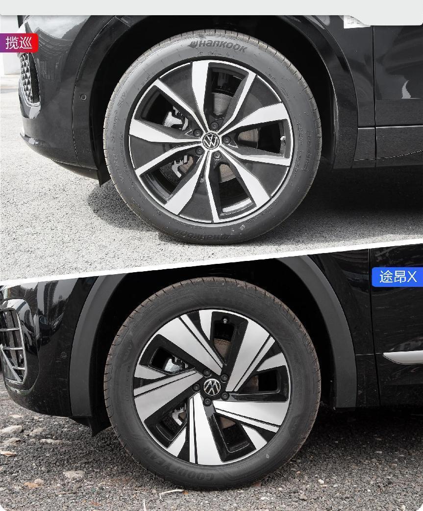 轮胎规格直接关系到车辆的动态稳定性和刹车性能,揽巡显然更看重这一点,它的轮胎规格达到了265/45 R21,途昂X稍小一些为255/50 R20。