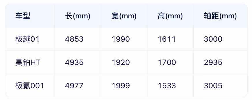 极越01长宽高分别是4853*1990*1611mm,轴距为3000mm;昊铂HT的长宽高为4935*1920*1700mm,轴距为2935mm;极氪001的4977*1999*1533mm,轴距为3005mm。