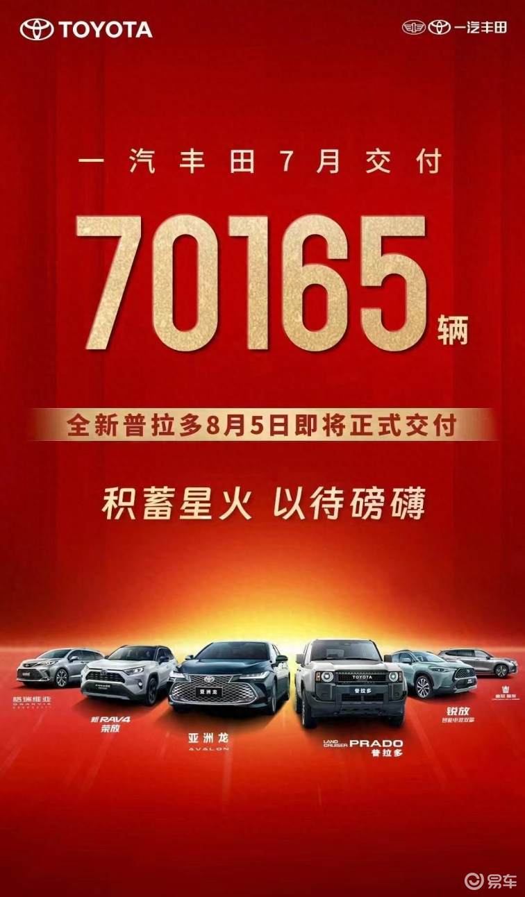 7月首份销量战报,一汽丰田七月交付70165台,环比6月有所下滑,减少了3000辆,但是比上半年整体表现要好很多。