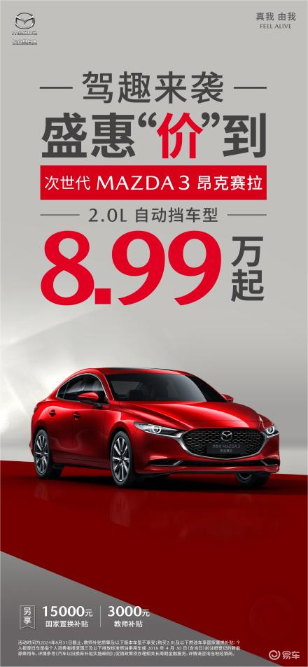 历经四代产品革新,次世代MAZDA3昂克赛拉将全球累计销量高达720万辆的传奇驾控车型MAZDA 3的综合实力推向了全新的高度:极具东方美学的「魂动」设计、更高次元的「人马一体」操控、全球大满贯的安全性能。先后荣获“2019德国红点设计大奖·至尊奖”、“2020世界年度车”三强、“2020世界年度设计车”、“2020中国年度车”、“2021中国十佳车身”等重量级奖项,堪称A级运动家轿的高价值之选。活动期间,2.0L自动挡车型8.99万起,符合条件的置换用户另享15,000元国家置换补贴,教育工作者再享3,000元专属补贴。
