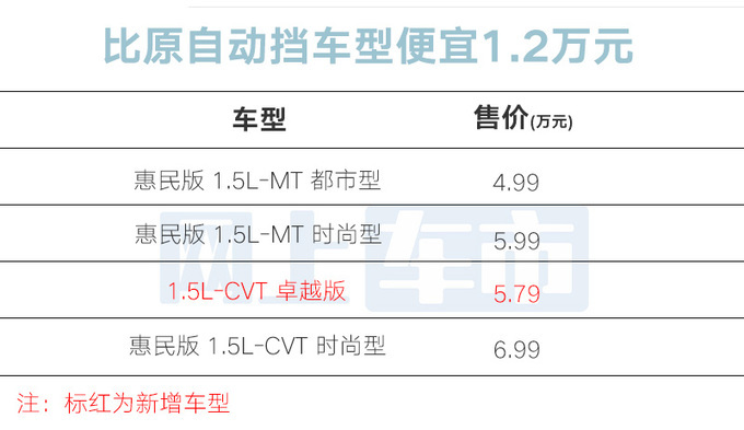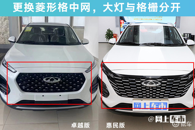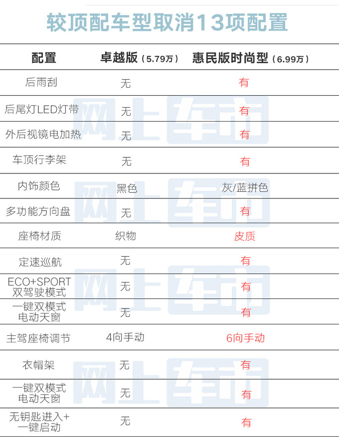 新车更换菱形点阵式中网,中间使用银色镀铬装饰,大灯与格栅分开,较惠民版时尚型取消后雨刮、后尾灯LED灯带、外后视镜电加热、车顶行李架、灰蓝拼色内饰、多功能方向盘、皮面料座椅、定速巡航、ECO+SPORT双驾驶模式、一键双模式电动天窗、主驾6向手动调节(变为4向)、衣帽架及无钥匙进入+一键启动共13项配置。