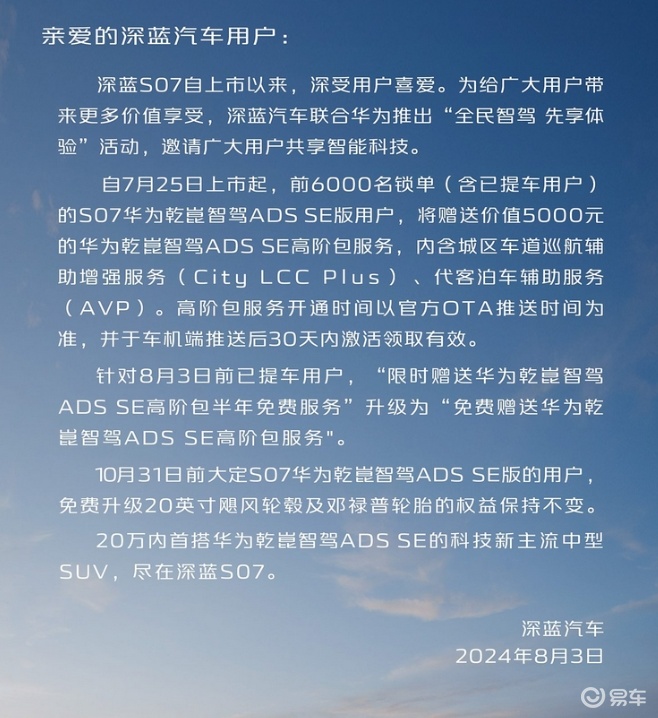 超值入手!深蓝S07权益加码,华为智驾终身免费用