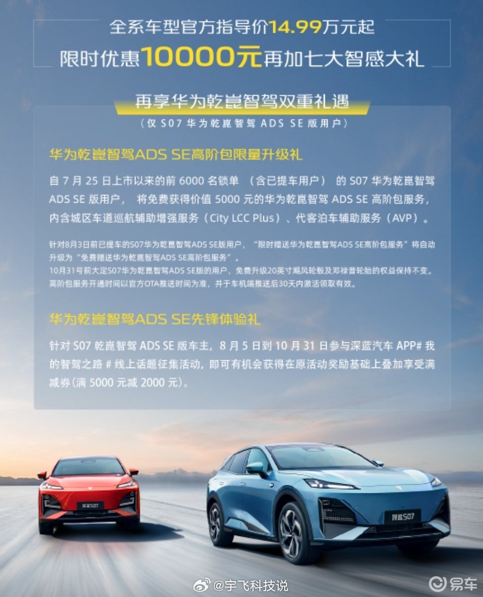 深蓝S07携手华为打造超值智驾体验,终身免费高阶包 免费用!