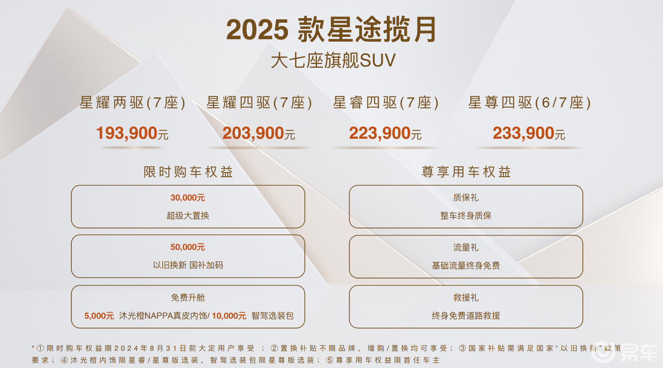 2025款揽月相比2024款主要在软硬件的配置方面略有提升,但由于发布时间恰逢“国家以旧换新 ”国补政策启动,再加上星途官方为置换/增购用户提供的30000元权益补贴,双重补贴加码共计50000元。因此,14.3万元起即可置换2025款星途揽月,这才是对用户的最大诱惑。