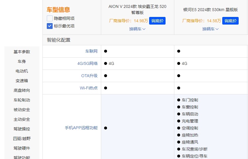 而在智能化配置方面,银河E5的语音识别控制系统可以说是全方位的,动动嘴可以控制空调、天窗、甚至座椅通风/加热等等,同时在手机远程APP功能同样秒杀对手,远程就可以控制空调、座椅通风等等,像虽然立秋了,但是天气还是很热,而远程开启空调或者座椅通风,用车就更加舒适了。另外15.4英寸中控屏尺寸更大,分辨率更是达到2.5K,查看非常便捷。而看AION V这边呢,差不多就手机互联能拿得出手了。