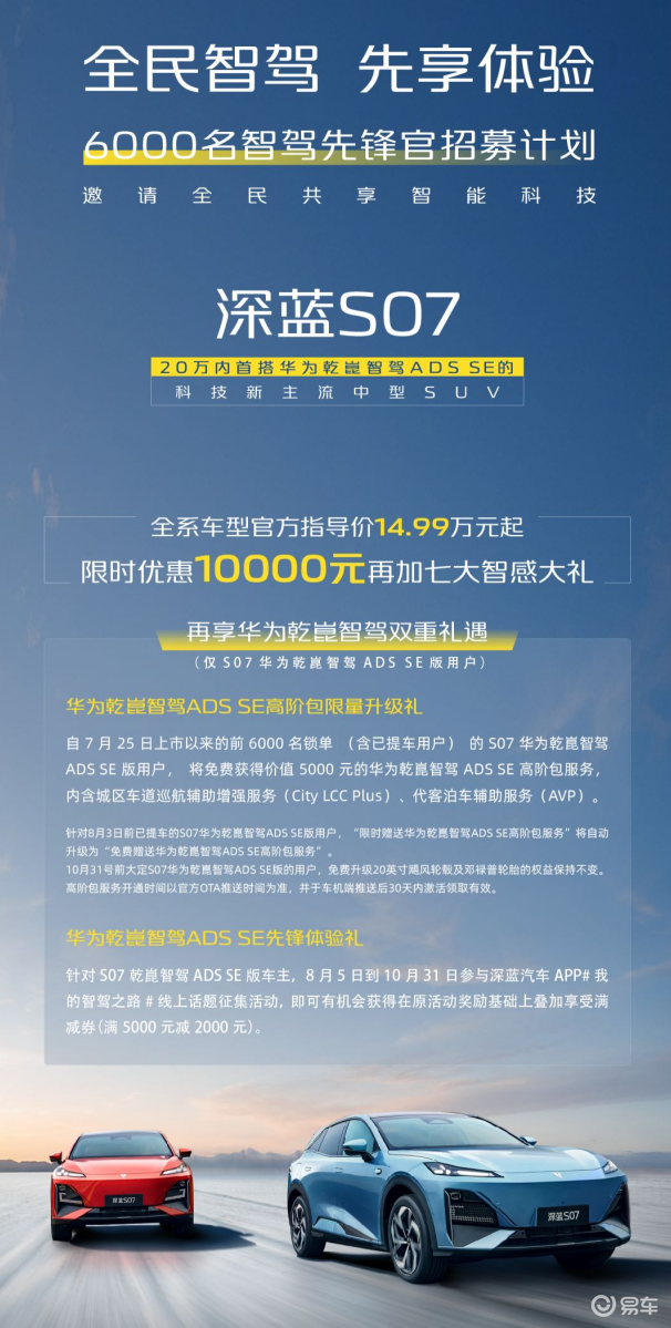 7月25日上市时,深蓝S07在官方限时优惠1万元之后,全系售价13.99万元起步,并限时赠送乾崑智驾ADS SE高阶包半年免费使用权。而现在,深蓝汽车购车权益进一步释放,推出了“全民智驾、先享体验”活动,华为乾崑智驾ADS SE高阶包限量终身免费订阅,手慢无!