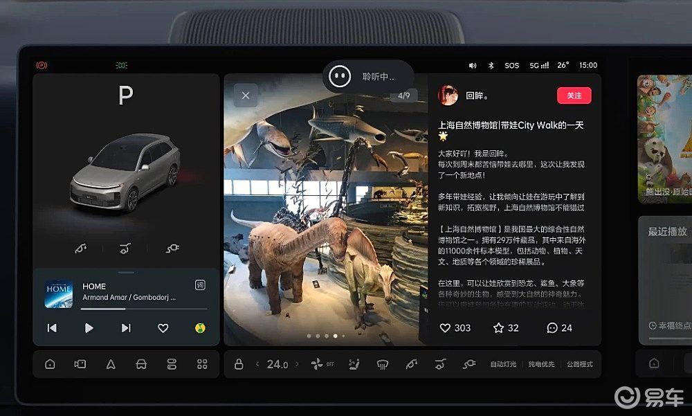 连体式大屏的设计,也可以证明理想L6的确比较懂家庭用户。有了副驾娱乐屏,坐在副驾的“女王”可以很方便地刷剧,驻车时副驾娱乐屏也可以让儿童看动画片甚至完成作业,可以说是为家庭用户量身定制。