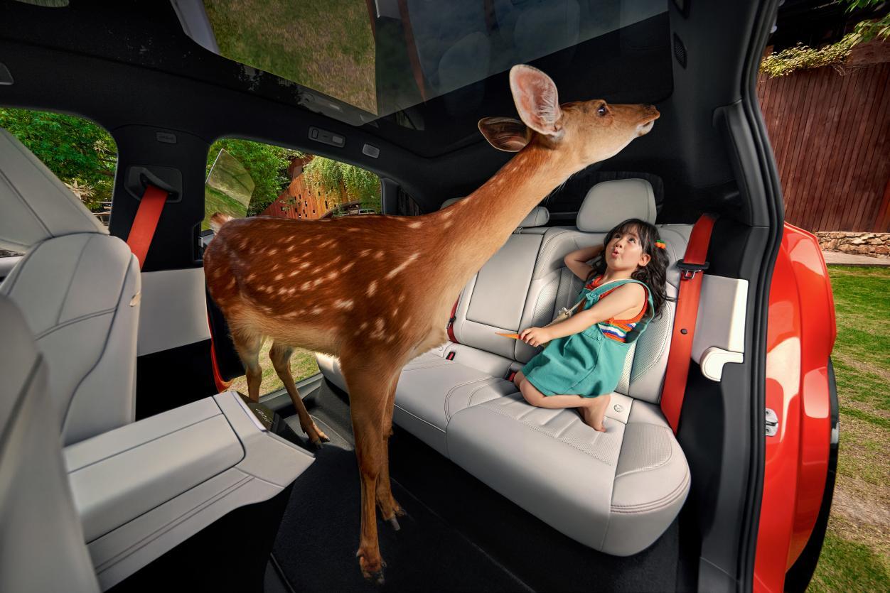乐道L60拥有1386mm超宽二排及1010mm有效二排头部空间,可以轻松容纳三个大个子。二排有效腿膝部空间也达到160mm,可以让两个183cm的成年人同时在车内翘二郎腿。在官方图片中,乐道拉来了一头小鹿站在了二排过道。其空间能力可见一斑。
