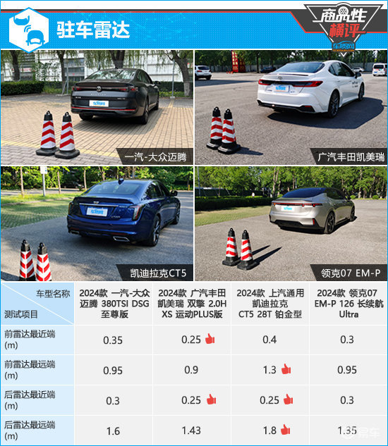 前雷达方面,同样是凯迪拉克CT5探测能力最强,数据层面达到1.3m。持续蜂鸣阶段提示距离方面,广汽丰田凯美瑞测试经验值完全吻合,便于驾驶者对障碍物距离作出判断。