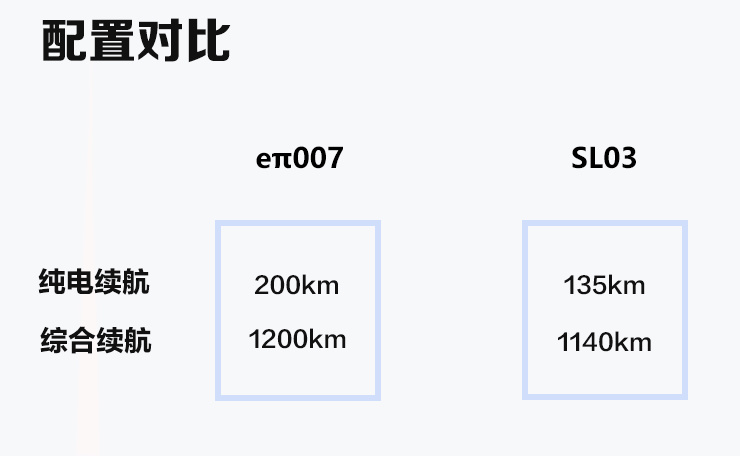 在电池和纯电续航方面,eπ007 搭载 28.40kWh动力电池,CLTC纯电续航可达 200km。SL03搭载18.99kWh电池,CLTC纯电续航里程为135km,相比之下eπ007的纯电续航里程更长,日常补能的频率更低,使用起来自然更加方便。在综合续航里程上SL03的表现不错,来到1140km,不过eπ007的表现更佳,达到惊人的1200km。