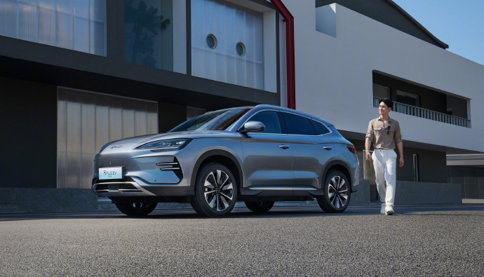 来到车身侧面,整体造型线条让新车的运动感十足,车窗周边以及门把手位置包裹了镀铬饰条,提升了整体质感。贯穿式的腰线设计不仅增加了车身的视觉长度,还让车身显得更加修长,第一眼看过去很难相信这是一款紧凑型SUV。19英寸的铝合金低风阻多幅式轮辋造型得体,为车辆更添动感。此外,悬浮式车顶的设计则显示出大气稳重之下的精致一面。再看车尾部分,整体层次感分明,尾部的字母标识改为可发光的“BYD”简写品牌LOGO。尾灯组采用贯穿式设计,取消了镀铬饰条的装饰,使得尾部整体性更强。反光灯带造型平直,后包围装饰了大面积的护板,整体外观更显精致大气。
