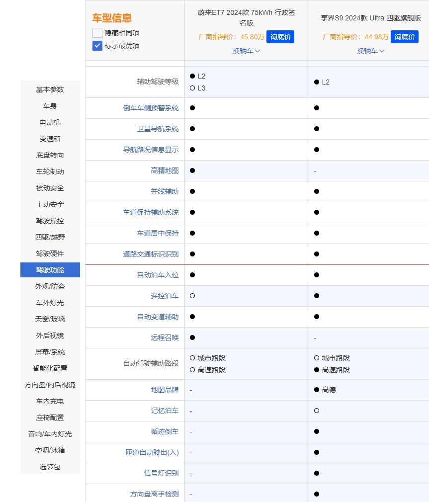 而在高阶智驾方面,显然还是享界S9更为出色,支持高速路段的自动驾驶辅助路段,而蔚来ET7需要选配才能获得,另外享界S9还独有循迹倒车、匝道自动驶出(入)等,令出行变得惬意和安心不少。