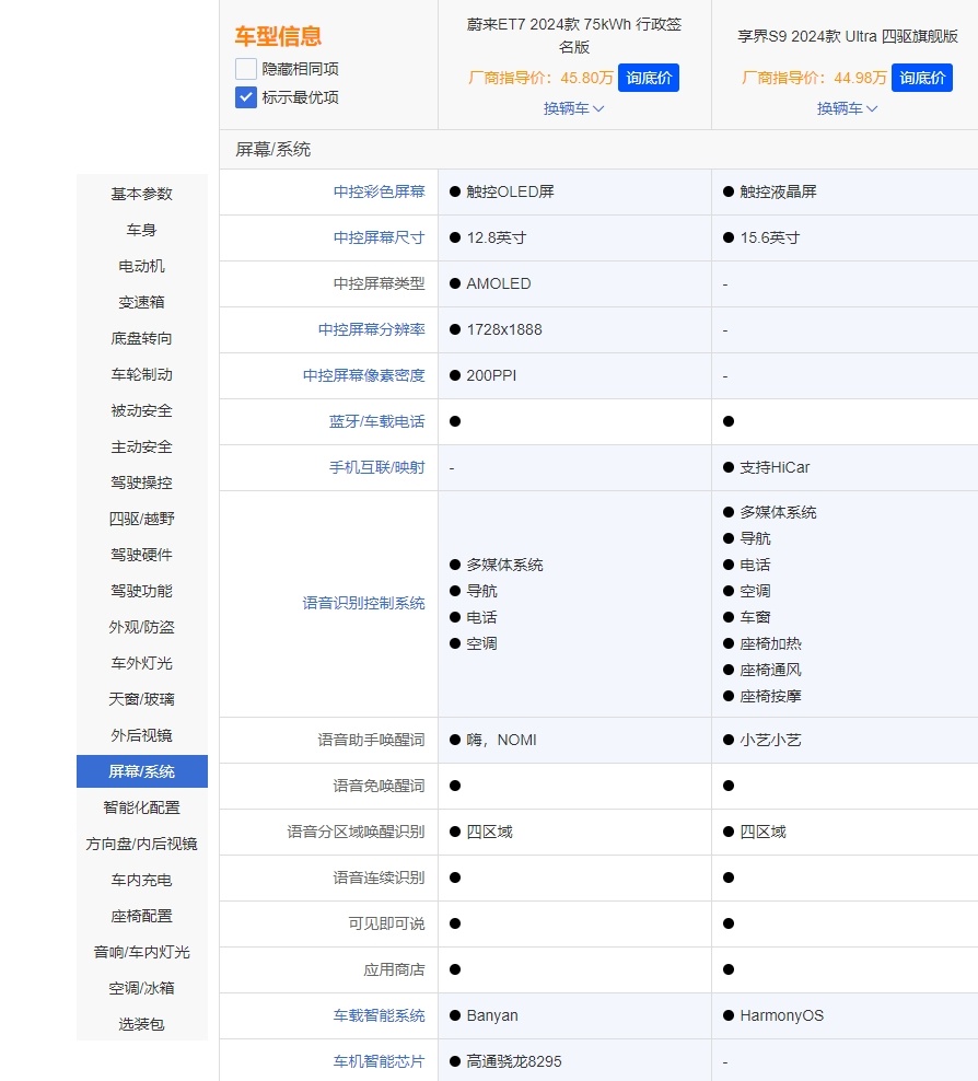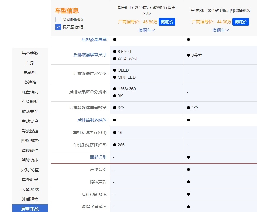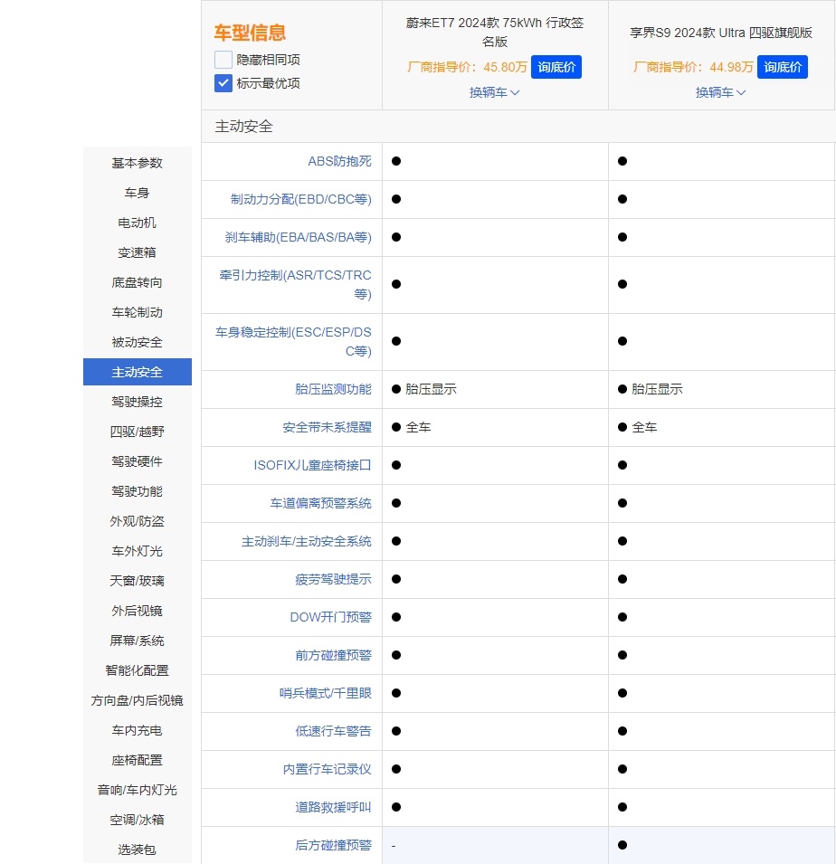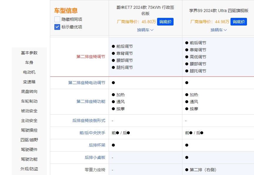 下面,我们把两车价格最接近的配置——蔚来ET7 2024款 75kWh 行政签名版(指导价:45.8万)和享界S9 2024款 Ultra 四驱旗舰版(指导价:44.98万)进行对比,看看孰强孰弱。