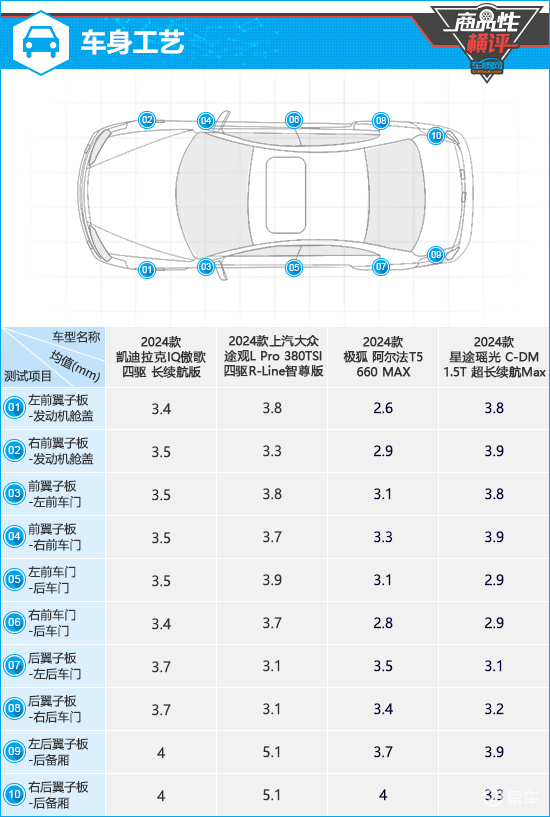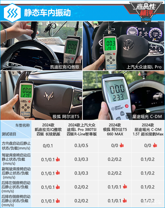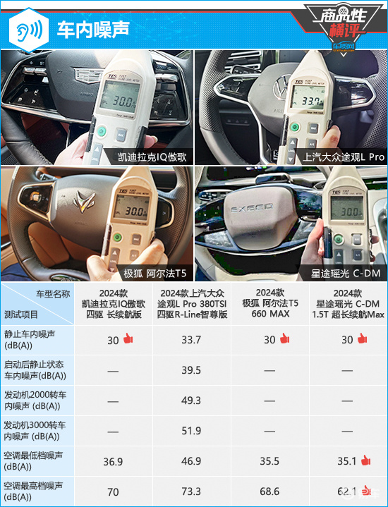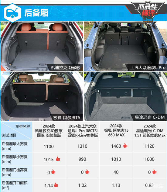 综合来看,上述四款中型SUV的整体表现都还比较不错,能够满足日常使用所需。其中,凯迪拉克IQ傲歌的得分最高,各方面表现也都很均衡,唯独后排座椅的测试成绩稍微有些“拖后腿”;极狐阿尔法T5和星途瑶光C-DM作为自主品牌的代表车型,同样保持了较高水准,整体表现能够令人满意。相比之下,上汽大众途观L Pro虽然在客观数据和主观感受方面的整体表现达到了专家评审团预期,但是在一些方面确实还存在优化空间,例如车身工艺、漆膜喷涂均匀性以及车内空气质量。消费者可以根据个人喜好以及关注点进行权衡后,再做选择。