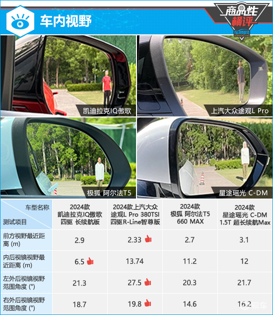 在外后视镜视野范围测试中,虽然凯迪拉克IQ傲歌和上汽大众途观L Pro的左侧外后视镜均采用双曲率镜片,但是后者的测试成绩明显还是要更好一些。综合来看,上汽大众途观L Pro左/右外后视镜视野范围均领先另外三款车型。