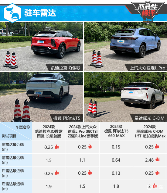 在正前方视野盲区测试环节中,我们采用高70cm的桩桶作为参照物,随后调整车辆相对位置,直至在主驾驶席可以看到桩桶上沿。根据已有测试数据来看,上汽大众途观L Pro的前方视野盲区最小,最近距离仅为2.33m。后方视野盲区方面,因为只有凯迪拉克IQ傲歌配备了流媒体后视镜,因此测试成绩十分突出,仅为6.5m。
