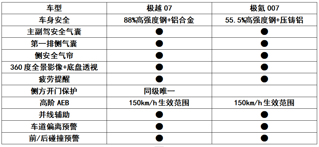 除此之外,极越07还拥有同级唯一的侧方开门保护,在人潮与车流涌动的街边很多人下车时不会有意识去观察周围的环境,有侧方开门保护可避免没有看到后方来车或行人造成的尴尬。相较之下,两款车均实现了较为完备的主被动安全防护,但极越07做的要更加到位。