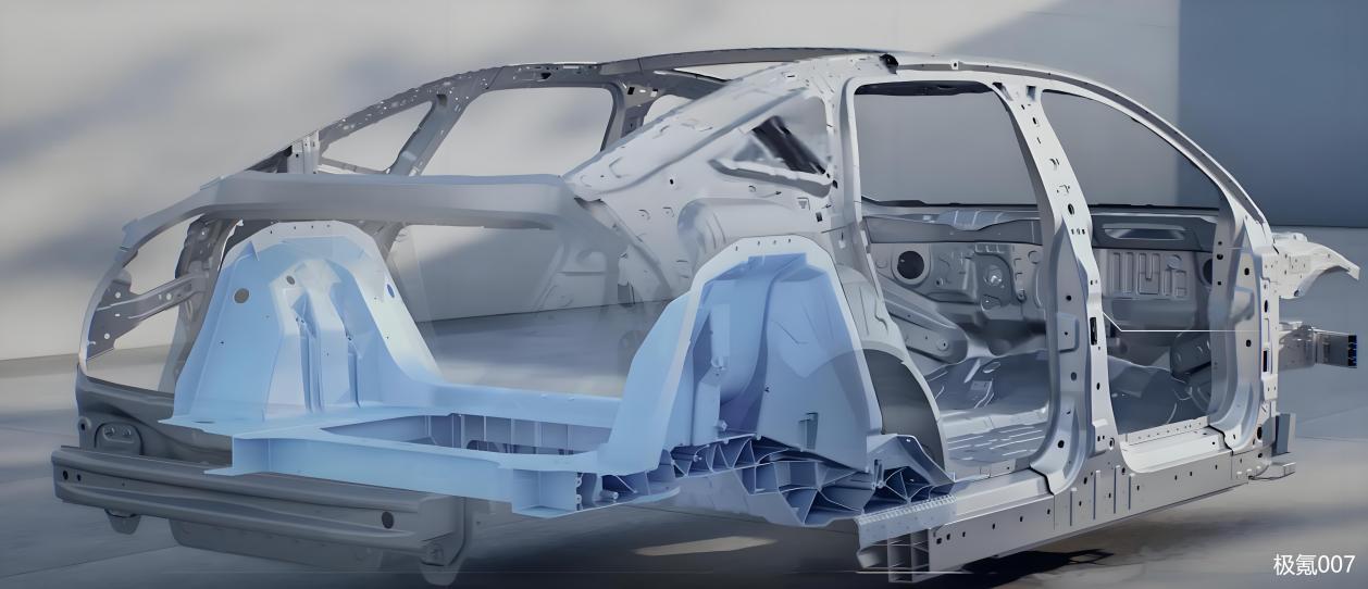 但两者在后悬上有所区别,极氪007采用多连杆独立后悬,其控制臂为铝合金,其余部分大多采用冲压钢板。