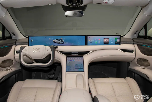 座舱设计依旧是阿维塔标志性的四屏布置,一个35.4 英寸一体式超长“带鱼屏”、一块 15.6 英寸横置中控大屏以及边缘两块 6.7 英寸用于流媒体外后视镜的副屏。