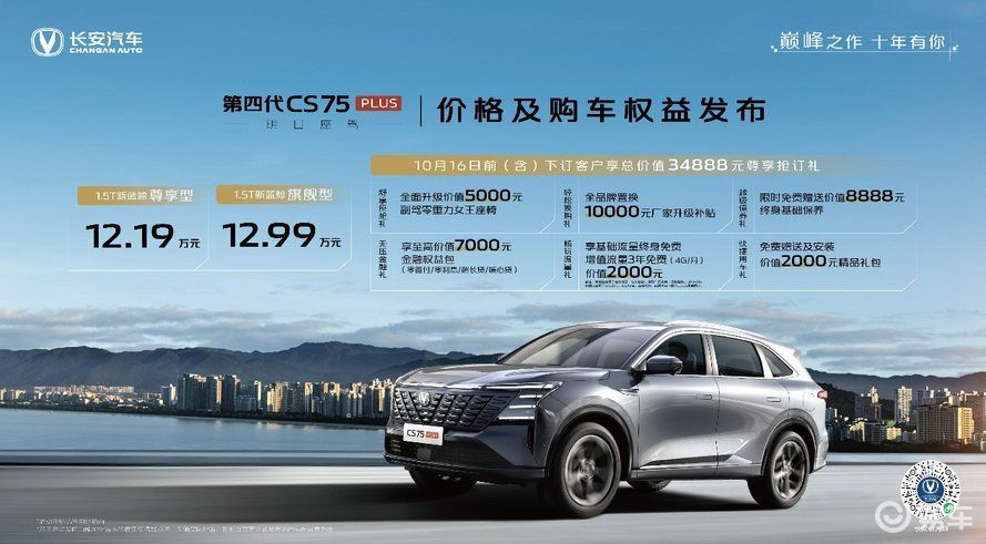 9月24日第四代CS75PLUS价格及购车权益发布的主题,就是“巅峰之作,十年有你”。1.5T新蓝鲸尊享型12.19万元,1.5T新蓝鲸旗舰型12.99万元。10月16日(含)前下定客户可享总价值34888元尊享抢订礼。12月,长安汽车还将带来2.0T的动力选择。