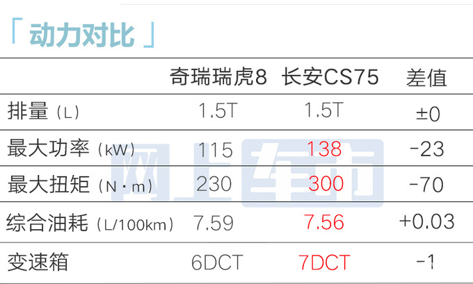 瑞虎8卓越版搭载1.5T发动机,最大功率115kW,峰值扭矩230N·m,匹配6MT或6DCT变速箱,WLTC综合工况油耗分别为7.49L/100km、7.59L/100km,账面参数略弱于长安CS75。