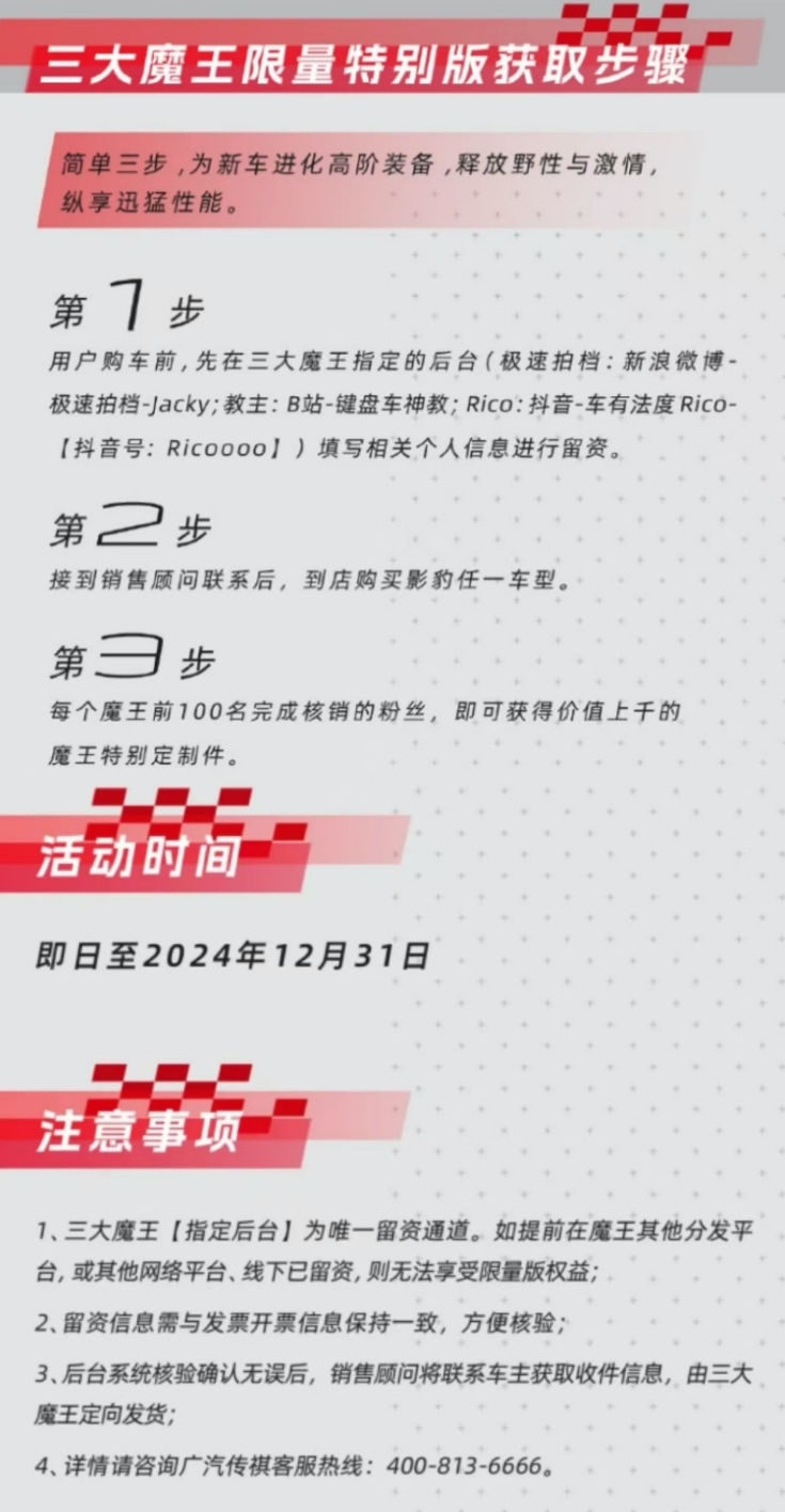 对“养成系”感兴趣的车友也有福了,谁说要改装就一定得“烧钱”?影豹替你立省百分百!2024款影豹三大魔王限定版,平等地给每个人机会get大咖同款!只需在购车前,在指定后台(Jacky&Nana:新浪微博-极速拍档-Jacky;教主:B站-键盘车神教;Rico:抖音-车有法度Rico-【抖音号:Ricoooo】,三者选其一)填写相关个人信息,每个魔王前100名完成购车核销的粉丝,即可获得价值近万元的限量定制件!想趁悠长假期给战车换换“皮肤”,现在就是最好的时机!