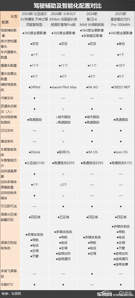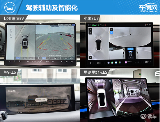 驾驶辅助系统方面,四款车型的辅助驾驶等级均达到了L2级,区别主要体现在了亮点功能上。比如,比亚迪汉EV独享了代客泊车,智己L6则是四款车型中唯一一款标配城市NOA的车型。相比之下,小米SU7在亮点功能上缺失较多,但好在提供了不少选装机会。