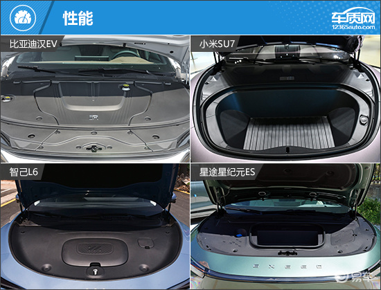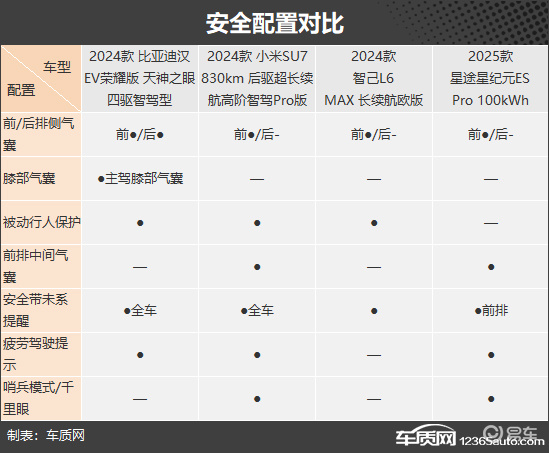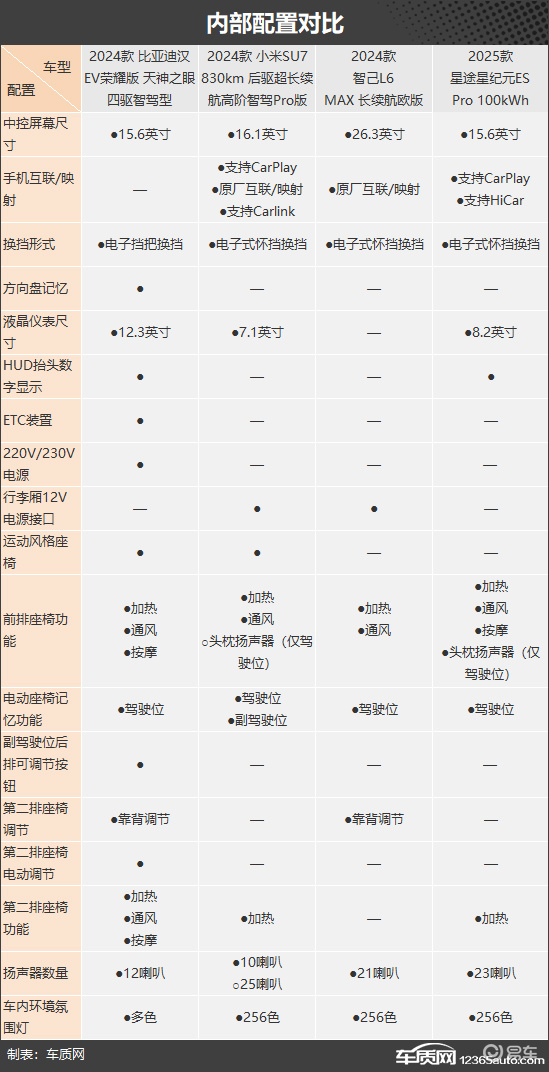 智能化配置方面,四款车型均处在同一水平,比亚迪汉EV荣耀版独享了后排控制多媒体,方便后排乘员操作;小米SU7在语音分区域唤醒识别上表现最佳,达到了五区域;智己L6则独享了多指飞屏操控;星途星纪元ES则在语音识别控制系统方面技高一筹。