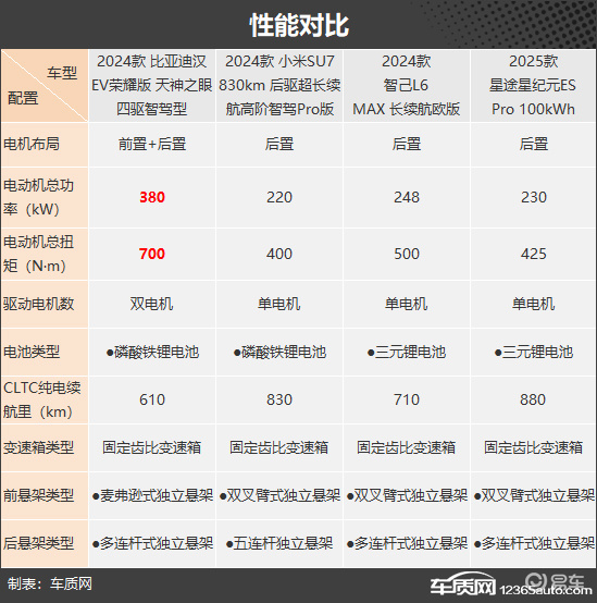 曾经,中大型车市场是自主品牌很难分得一杯羹的高端市场,不过随着新能源时代的到来,这一市场也是迎来巨变。本次挑选的四款车型都很有特点,比亚迪汉EV荣耀版主打成熟稳重;小米SU7则代表“年轻一代”;智己L6在设计上别具一格;星途星纪元ES则凭借更长续航、更快的充电效率,展现出了“技术理工男”一面。毫无疑问,这四款车型可以说是各具特色。至于该如何选择,就要看您的个人喜好了。