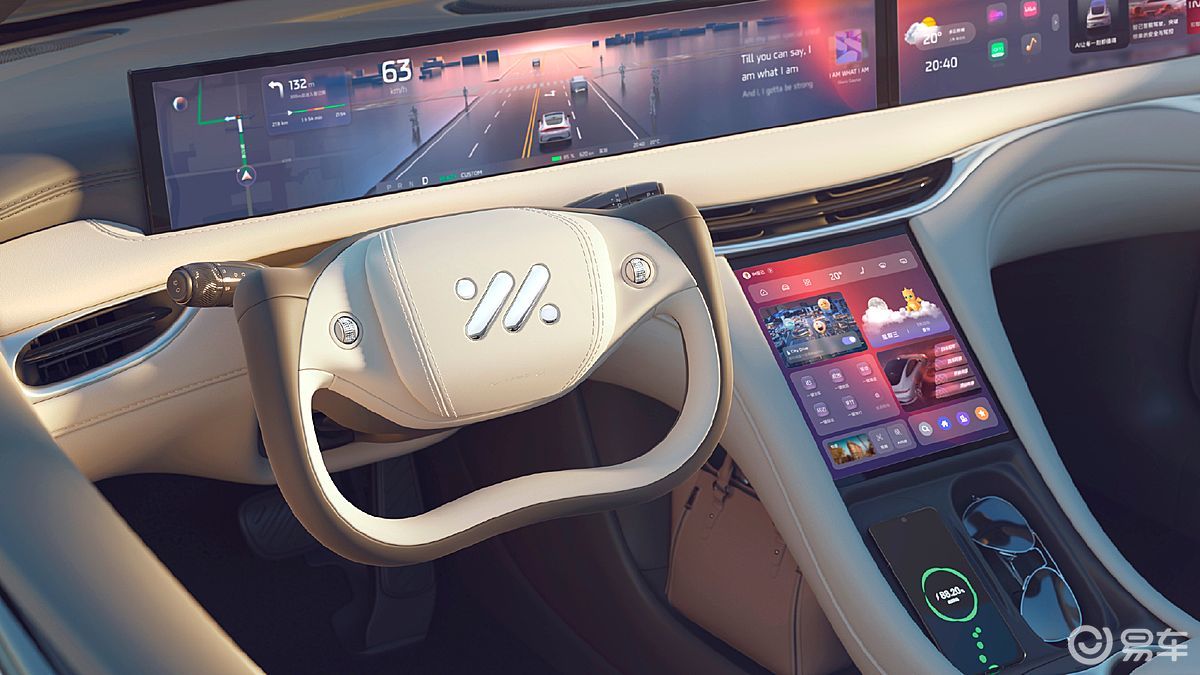 智己LS6这边则比较有特点了,采用了升降式26.3+10.5英寸的屏幕组合,半幅式方向盘、零重力座椅及车内主动降噪功能配置也都有搭载。内饰风格更偏科技未来感。