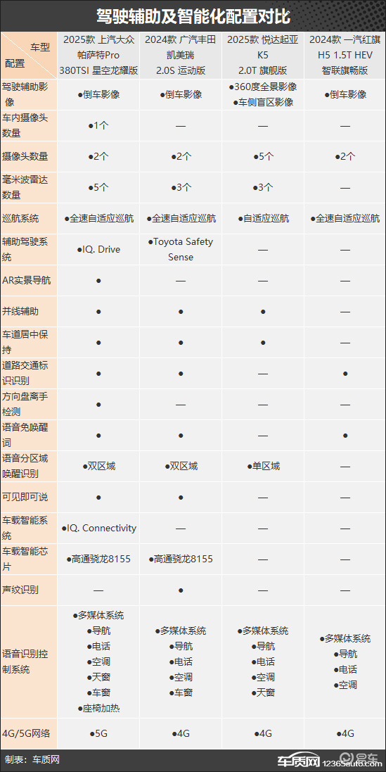 智能化配置方面,上汽大众帕萨特Pro依旧是独占鳌头,不仅独享了5G网络,而且在智能语音交互方面的表现更为全面,领先其余三款车型。相比之下,起亚K5和一汽红旗H5在语音交互方面均有所欠缺。