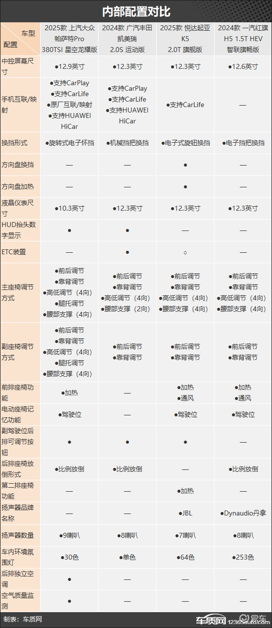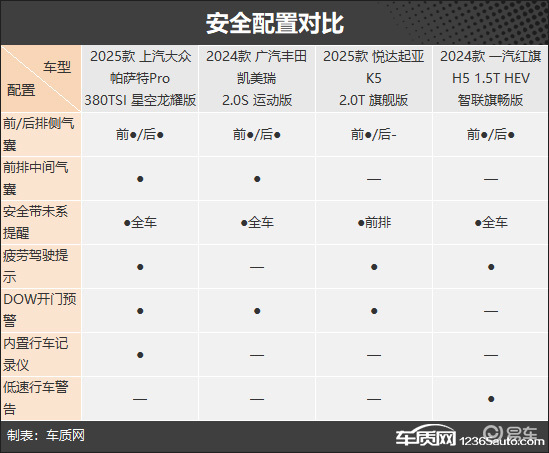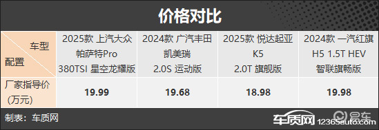 随着市场竞争的愈发激烈,中型车市场已经发生了巨大变化。此次推荐的四款车型中,上汽大众帕萨特Pro的整体表现相对较好,尤其是在驾驶辅助和智能化配置方面,可更好地满足消费者需求;广汽丰田凯美瑞保持了一贯稳重的形象,各方面表现中规中矩;悦达起亚K5的优势体现在性能方面;而一汽红旗H5则在燃油经济性方面更胜一筹。总体来看,无论是哪一款车,均有让人选择的理由。至于该如何选择,就要看您的个人喜好和具体的用车需求了。