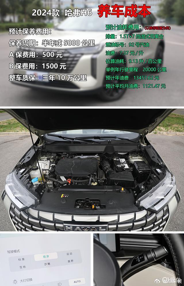 越便宜的燃油车或许消费者会越在乎养车成本,那么2024款哈弗H6的表现如何呢?首先来看看保养方面,新车保养周期为半年或5000公里,相比那些一年或10000公里一保的车型吗,无形中就会增加预算,其中A保费用500元,B保费用1500元左右,说实话也不算便宜了。油耗方面,郝哥同样以推荐配置1.5T车型为例,新车工信部综合油耗显示为7.13升/百公里,为了更接近真实,郝哥以再增加两个油计算,也就是9.13升,目前北京地区92号汽油的油价为7.37元/升,假如每年行驶20000公里,那么预计您的年油费为13457.62元,平均月油费为1121.47元,不知道这样的油耗水平您还满意么?