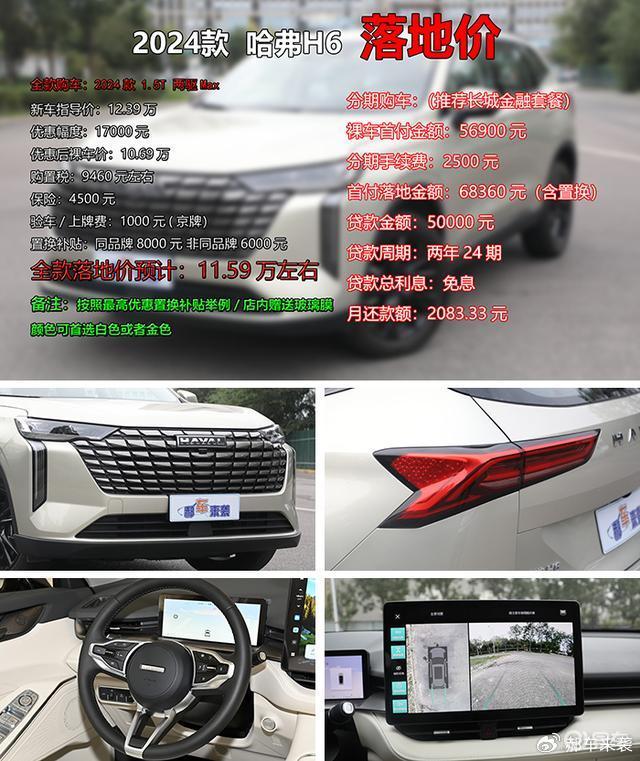 既然选好了车型,那郝哥就来为您算算落地价吧,推荐配置2024款哈弗H6 1.5T 两驱Max官方指导价12.39万,优惠1.7万元后裸车价为10.69万元,购置税9460元,保险大概4500元,验车上牌费得1000元。与此同时,如果是同品牌置换还能享受8000元置换补贴,非同品牌6000元,假如按照最常见的非同品牌置换补贴举例,那么最终全款落地价预计为11.59万元。