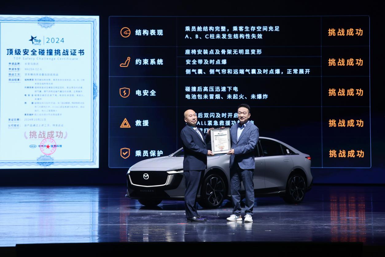 安全性方面,长安马自达EZ-6进行了行业首次“货车横向夹击叠加刮底挑战”并取得了优异成绩。本次碰撞测试基于丁字路口大货车高速冲撞车身侧面,叠加车辆底盘电池包托底,最后撞向墙面的真实场景,挑战难度堪称“地狱级”。EZ-6为了提升⻋身刚性,A柱采⽤了多层设计,⻋身关键部位焊点、结构胶采⽤了特殊工艺,增加强度;⻋顶横梁增加加强件,⻋身超高强度钢材强度达到2000Mpa,A/B柱、⻋门防撞梁、座椅横梁采⽤1500Mpa高强度热成型钢等等,让力的传导更直接,⼈⻋交流更直接;7横5纵全钢笼式结构既保证乘员生存空间,也⼤幅提升了⻋身的扭转刚度;