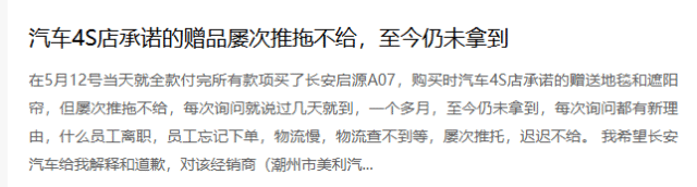 无独有偶,就在启源A07也想着要不要加大优惠力度“抢回”市场份额时,品质及售后出问题了。随着新车的交付,投诉接踵而至,问题包括车机卡顿、制动不流畅、异响,甚至售后等问题在车质网、黑猫投诉等平台频频上新。