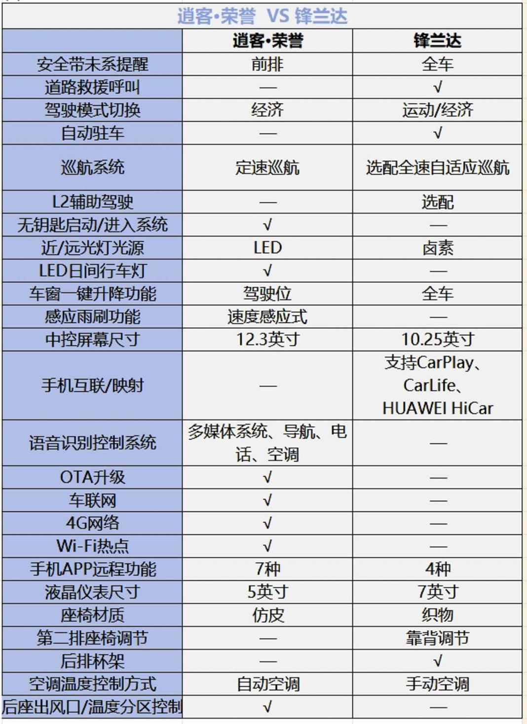 从配置上看,逍客·荣誉的配置更加丰富一些,基础的配置不缺,内饰配置上会更加注重舒适性一些,而锋兰达有了更多的选配空间。