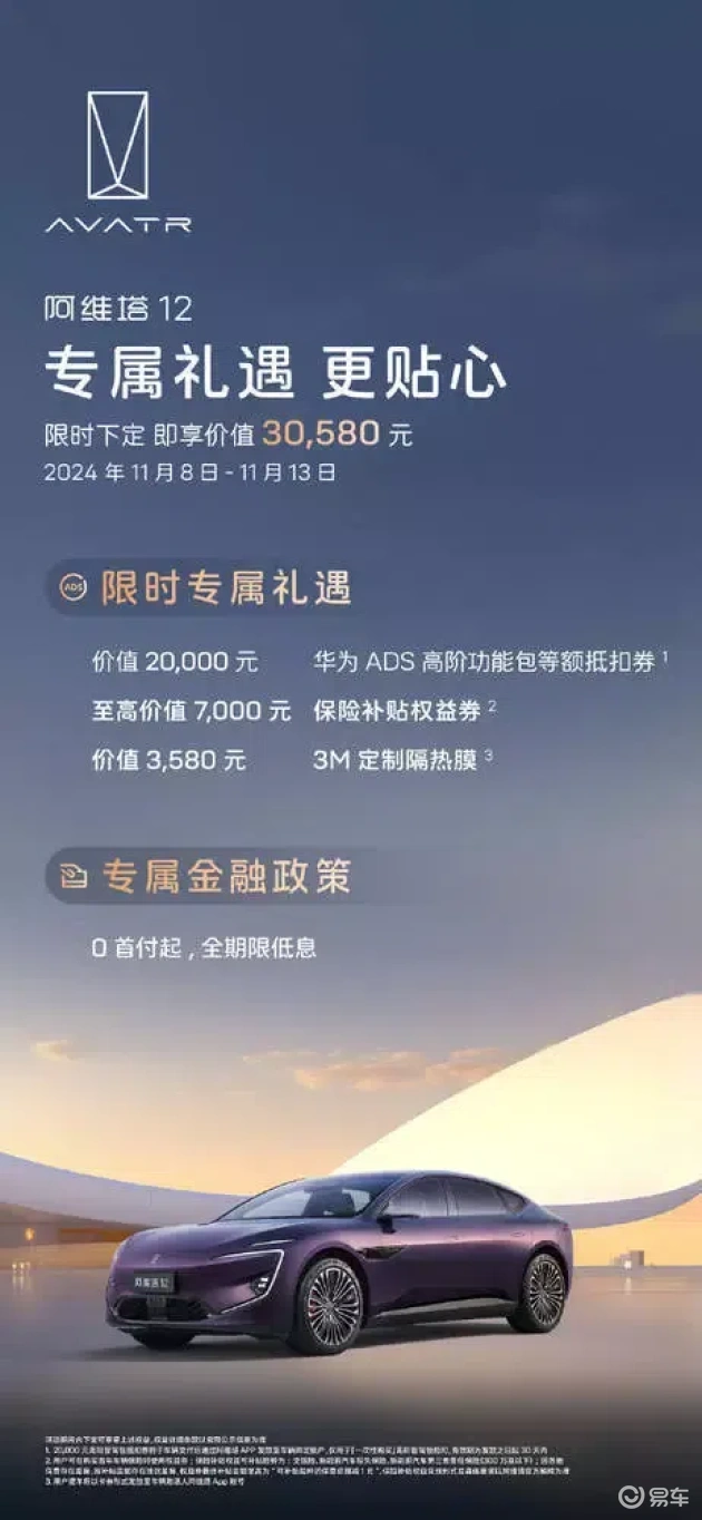 【CNMO科技消息】11月8日-11月13日,阿维塔汽车开启双11限时福利活动,下定阿维塔11 2024款 ,即享至高115580元豪礼;购阿维塔07,限时尊享至高44580元礼遇;下定阿维塔12,享价值 30580元专属礼遇。全系车型均赠送价值20000元华为ADS高阶功能包等额抵扣券&价值3580元3M定制隔热膜。
