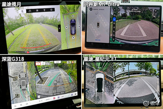 在影像辅助系统方面,四款车均配备360°全景影像系统,整体画质清晰,同时车辆周围的畸变控制也比较合理。此外,四款车的影像系统均带有倒车辅助线,并且支持3D画面显示和透明底盘功能,实用性表现可圈可点。