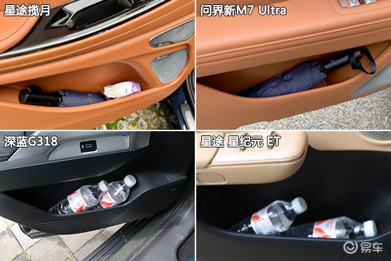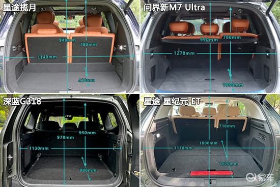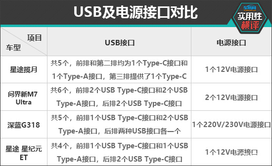本期参与对比的四款热门中大型SUV不仅种类丰富,而且实用性表现也完全令人满意。星途揽月是四款车中唯一的6座车型,但实用性表现不错,不仅全车座椅均配备了可调节的独立头枕,而且还配有6个杯架、5个USB接口以及一个12V电源接口,能够满足车内人员的日常使用需求;问界新M7 Ultra的科技配置表现大家是有目共睹,在实用性方面也有着不俗的实力,其中后备厢空间表现就是四款车型中最好的,可以放置更多的物品;深蓝G318主打越野,但实用性方面也并没有落下风,例如主驾驶座椅前后移动距离达到了290mm,并且后备厢内部垂直高度达到950mm,可以放置较高的物品;星途星纪元 ET的雷达功率方面有着不错的表现,尤其是后驻车雷达,最远探测距离达到1.4m。综合来看,四款车在实用性方面互有胜负,但并不存在明显的短板,消费者可以根据自身喜好进行选择。