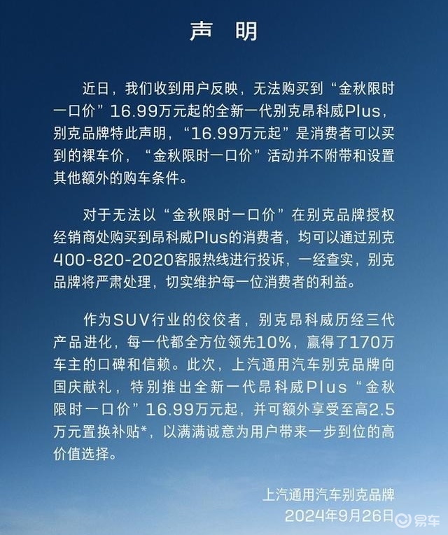 9月26日,上汽通用汽车别克品牌发布声明称:近日,我们收到用户反映,无法购买到“金秋限时一口价”16.99万元起的全新一代别克昂科威PIus,别克品牌特此声明,“16.99万元起”是消费者可以买到的裸车价,“金秋限时一口价”活动并不附带和设置其他额外的购车条件。对于无法以“金秋限时一口价”在别克品牌授权经销商处购买到昂科威PuS的消费者,均可以通过别克客服热线进行投诉。一经查实,别克品牌将严肃处理,切实维护每一位消费者的利益。