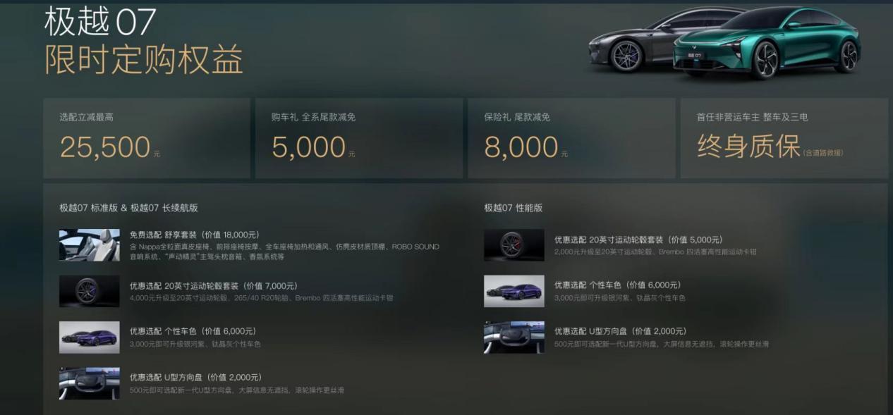 价格方面,极越07的官方指导价为20.99-29.99万。极越07目前也推出了限时定购权益,包含购车礼:全系尾款减免5000元;保险礼:尾款减免8000元以及选配立减至高25500元、首任非营运车主整车及三电系统终身质保等权益。由此可见,极越07在优惠方面力度较大,性价比表现突出。