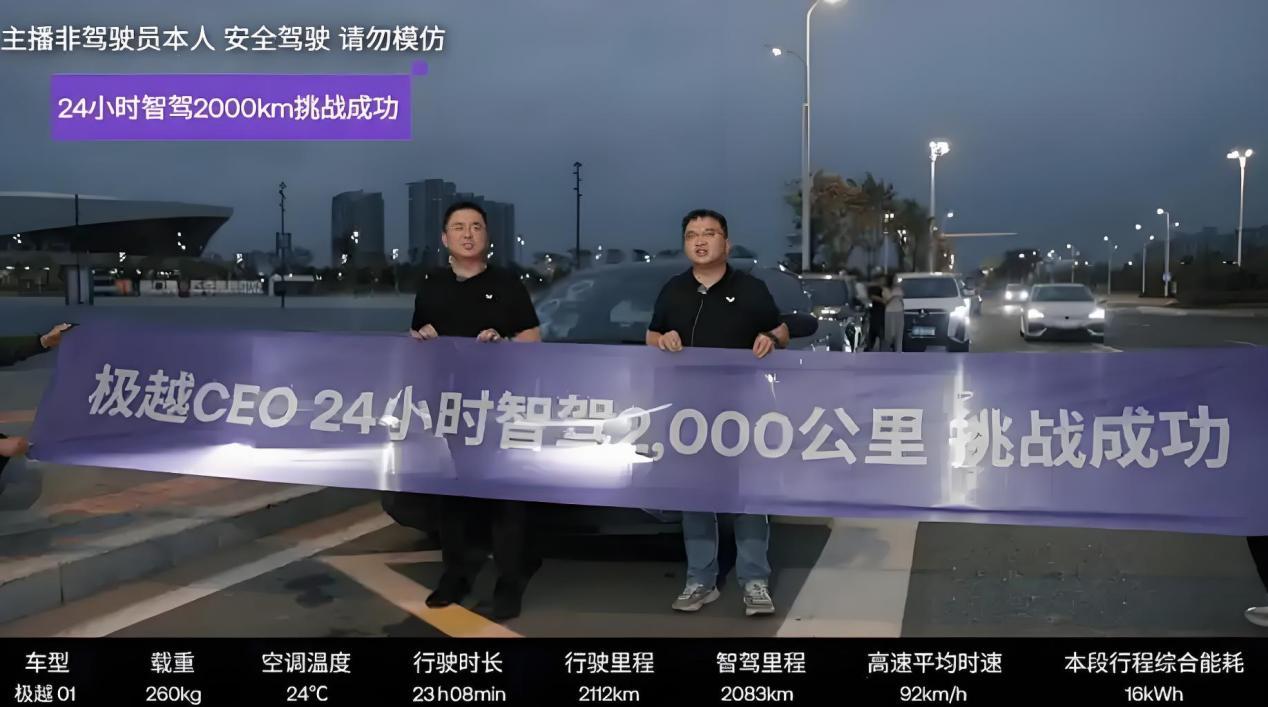 或许是受到了第三方评测佳绩的鼓舞,极越品牌的CEO夏一平毅然决定亲自上阵,发起了一场“极限挑战”——24小时内智能驾驶行驶2000公里,并且全程进行直播分享。