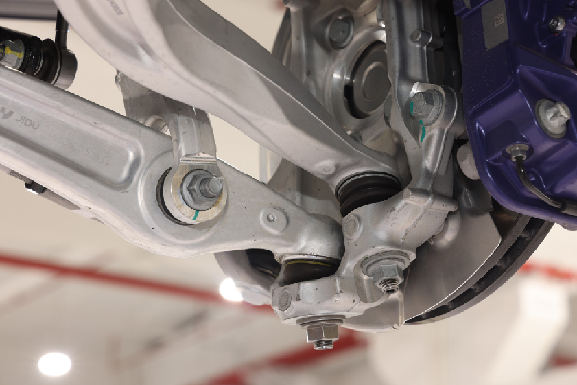 悬架结构方面,极越07与极氪001均采用了前双叉臂、后多连杆的独立悬架形式。这种悬架组合是高端电动车中常见的配置,旨在提供优秀的操控性和乘坐舒适性。然而,两者在细节上有所不同。极越07在悬架系统中大量使用了铝合金材质,这一设计不仅有效减轻了簧下质量,还提升了车辆的操控响应速度。此外,极越07的后悬架采用了H-Arm多连杆结构,这种设计在保持运动性能的同时,也兼顾了家用车的舒适性。在实际驾驶中,这种悬架结构能够更有效地吸收路面震动,保证车内的平稳性。