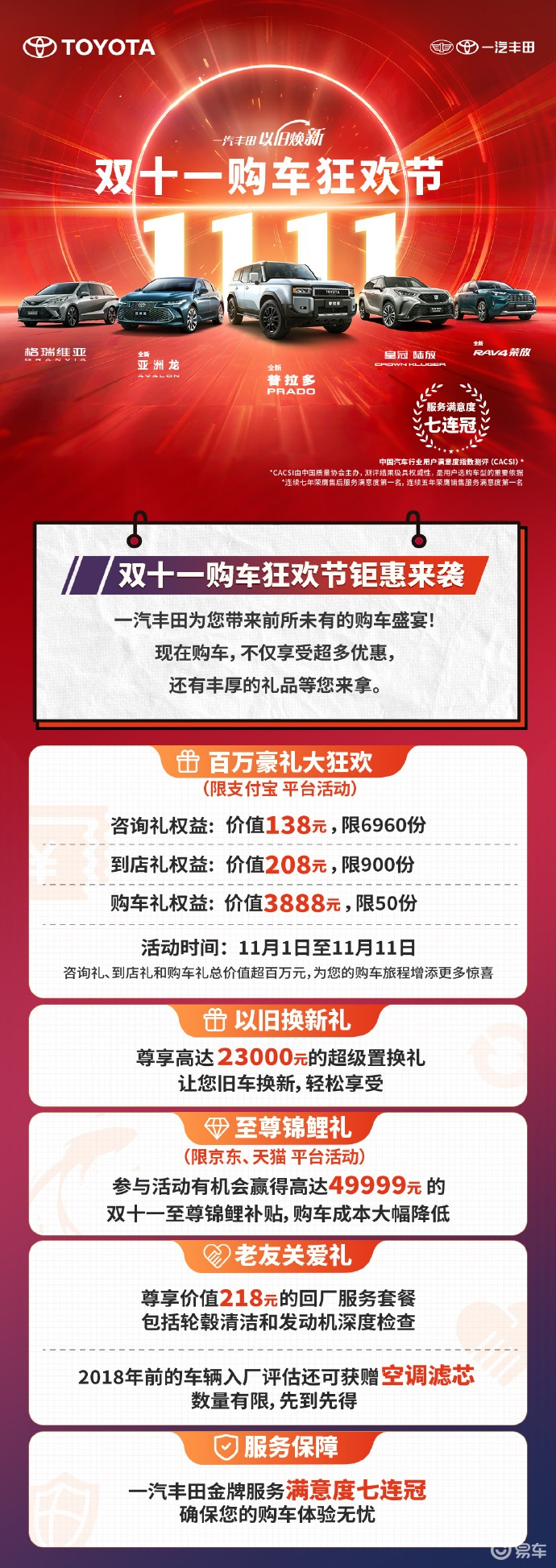 进入11月,岁末年尾之际,车企冲刺年度销量目标的剩余时间仅剩两个月,各种“限时钜惠”“年末嗨购”等购车优惠政策密集发布,对于打算购车的朋友来说,当下可以说是抄底购车的最佳时机了。而论“宠粉”力度,一汽丰田榜上有名。11月,一汽丰田推出了“以旧焕新 双十一购车狂欢节”,参与促销活动的用户,可享至高2.3万元置换补贴,成交用户可有机会获得至高49999元双十一补贴。另外,格瑞维亚还有专属的50%首付2年0利率,0首付起2-5年金融低息贷款,至高可享8000元厂家置换补贴等多重金融政策、置换补贴,以及丰厚的回厂、入厂、留资礼品,空前政策力度为用户创造最佳购车时机。