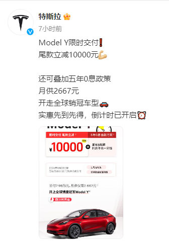 最怕销冠降价,年底一到,连特斯拉的弦都绷紧了。今天,特斯拉Y上马尾款立减1W活动,售价23.99万起。再叠加5年0息金融方案、以旧换新补贴等,买电车最少可省5万。