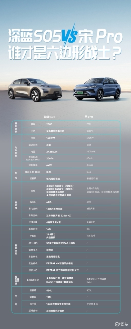 那站在消费者角度,两车之间又该如何抉择呢?我们不妨在产品维度找寻答案。(具体车型下文均简写为:深蓝S05、宋Pro DM-i)